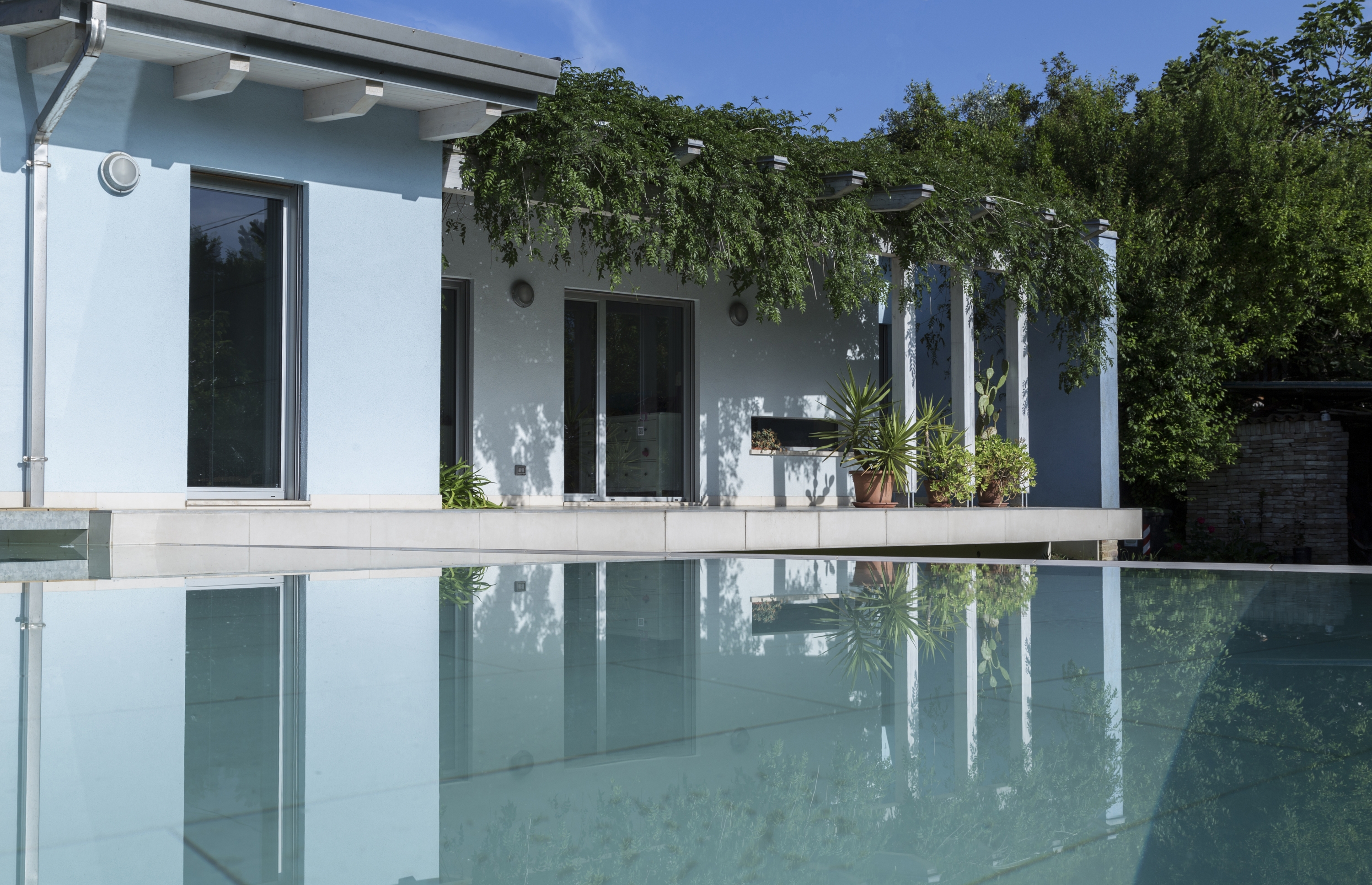 Per una architettura di emozioni nella ricerca di un equilibrio tra architettura e natura, il verde, la luce e l’acqua diventano gli elementi protagonisti del progetto. Una rigorosa organizzazione degli spazi interni, caratterizzati da ampie vetrate calibrate per dilatare gli ambienti ed evidenziare quadri prospettici, e una lunga vasca d’acqua, che penetra nell’edificio separando la zona notte dal soggiorno amplificano la qualità emotiva degli spazi, arricchiti da un rapporto visivo intenso e continuo tra interno ed angoli suggestivi di giardino.